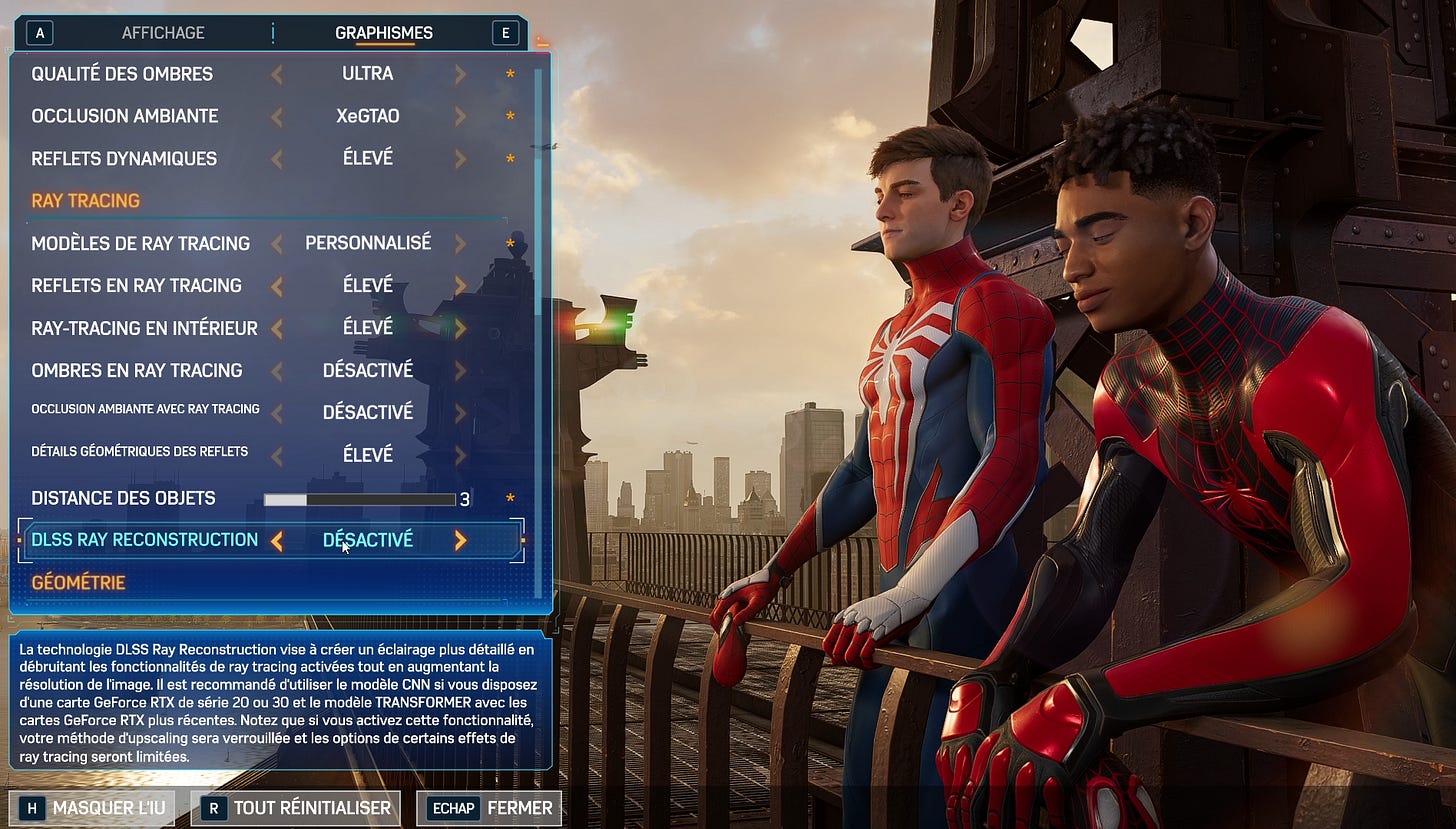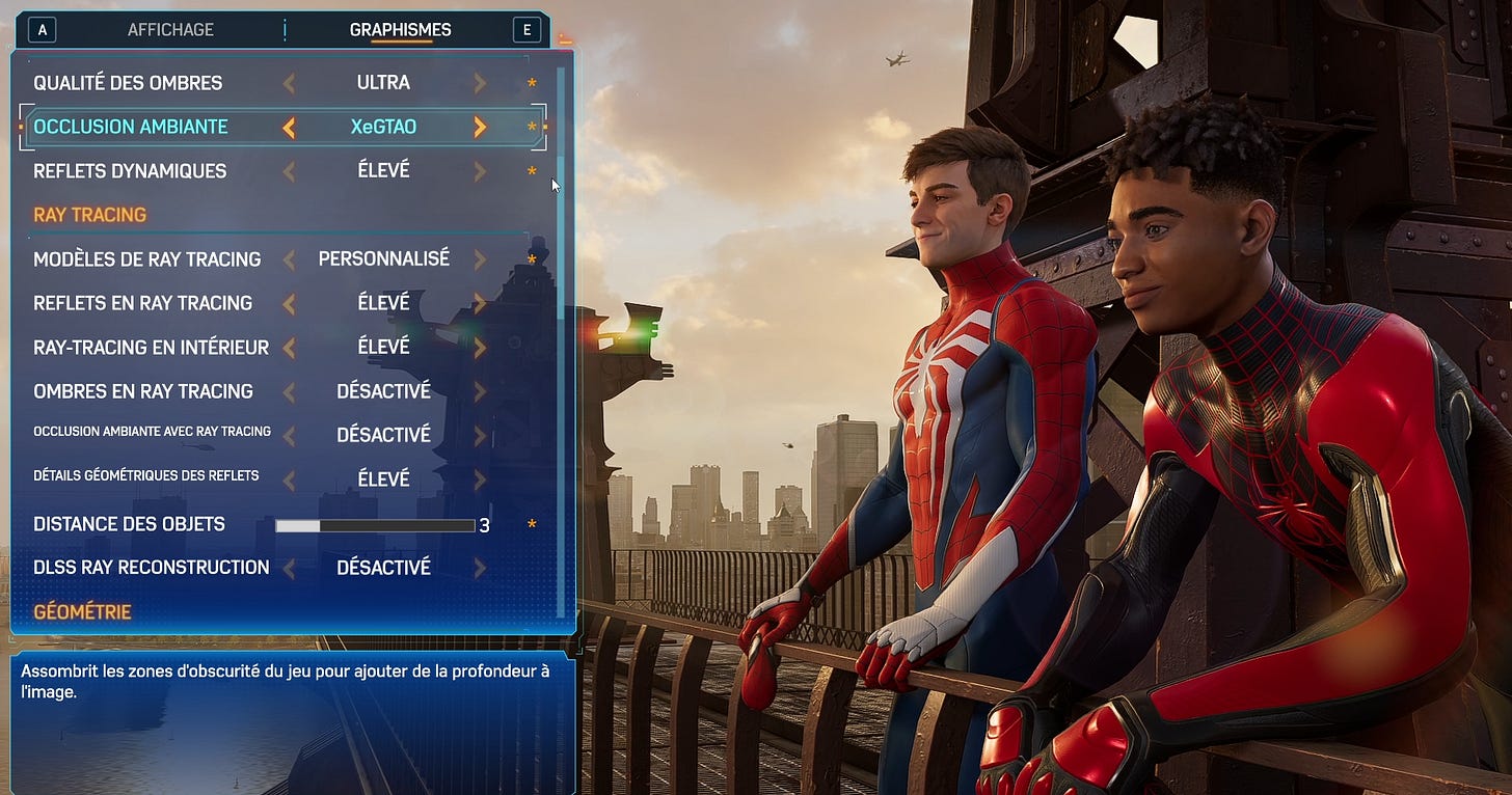 J’ai récemment essayé Spider-Man 2 de Insomniac Games, mais c’est quoi cette liste d’options ?! Je peux activer/désactiver trouzemille effets de lumières, y’a 40 types de flou différents, autant de réglage pour le RTX et l’occlusion ambiante, je veux pas le développer le jeu, je veux y jouer !